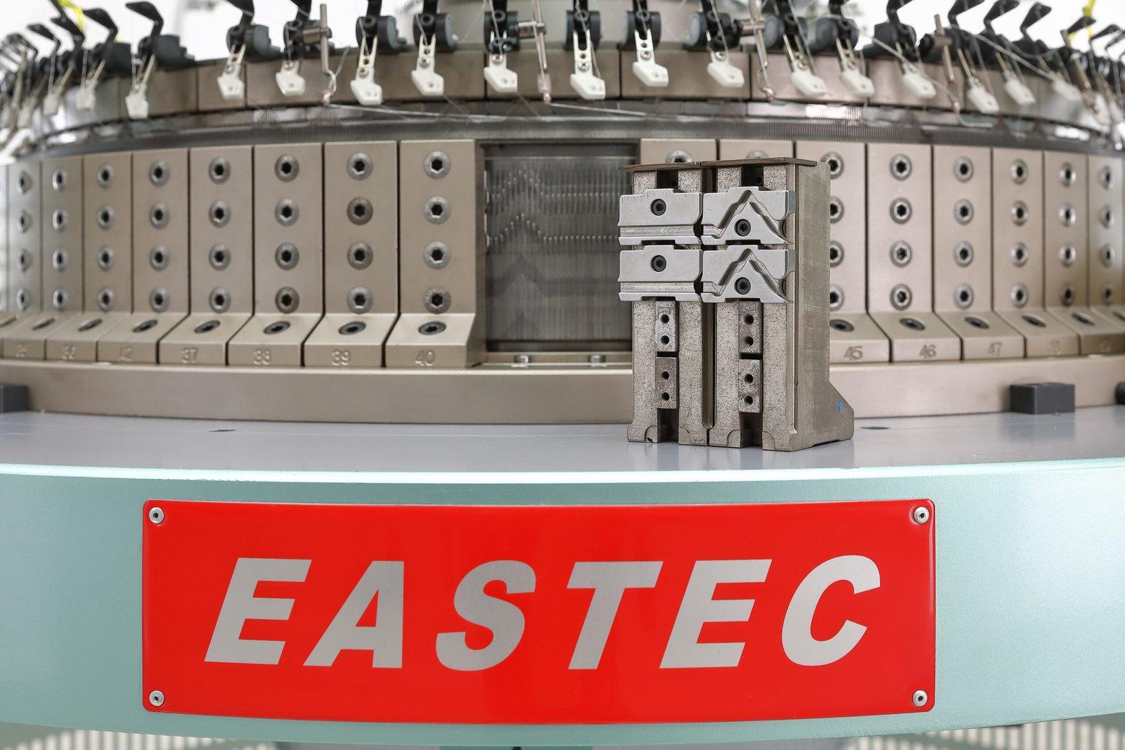 Upper plate with two track, foot wall with four track needle system, allowing diverse fabric production with full, half, and plain needle adjustments.