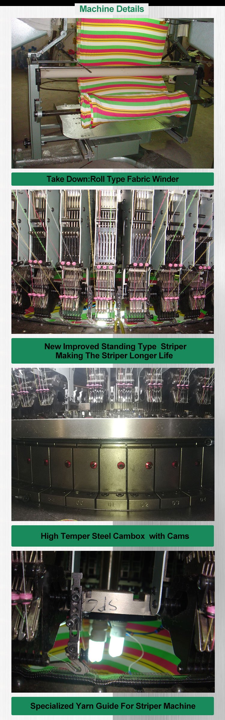 Open width 4 colors 6 colors striper circular knitting machine Equiped with international advanced computerised needle elector control sysrem, can change the strliper properly on time and high stability.